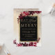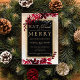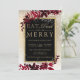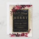 Iss, trinke und sei fröhlich! Eine moderne, schicke und elegante Goldtypografie mit floraler, roter Bordeaux-Aquarellwein, Weihnachtsweih-Party Einladung mit handgemalten, roten Wasserfarbenblättern auf einem schicken gelben Farbverlauf mit weißem Schnee und Schneeflocken. Ideal für Weihnachten oder Hochzeiten.