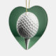 Ein weißer Golfball auf einem weißen Tee vor einem grünen Hintergrund, der auf einem herzförmigen dekorativen Keramik-Ornament platziert ist