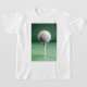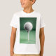 Ein weißer Golfball auf einem weißen Tee vor einem grünen Hintergrund.