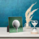 Ein weißer Golfball auf einem weißen Tee vor einem grünen Hintergrund. Fügen Sie Ihren eigenen Text hinzu.