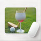 Auf dem Gras befindet sich ein Glas Wein zum Thema Golf, das einem zum Teil mit Rotwein gefüllten Golfball ähnelt, neben einem Golfclub und einem Golfball, der das Arrangement vervollständigt