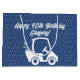 Niedlicher, weißer Golfwagen mit Schlägern, individueller Happy Birthday Gruß (oder was auch immer Sie gewollt haben) auf dunkelblauem Hintergrund mit einem Diamantmuster in weißem Overlay. Perfekt zum Geburtstag, zum Geburtstag, zum Geburtstag, zum Bachelor oder zum Trauzeuge.