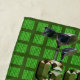 Der Name Golf in einem dimensionalen Design mit zwei Golfklubs dahinter ist auf grün karierten Tartan abgebildet