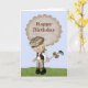 Ein kleines Mädchen mit blonden Haaren und grünen Augen in karierten Hosen und Hut gekleidet, und mit einem Golfclub mit Bogen darauf. Geburtstagskarte für ein junges Mädchen, das gerne Golf spielt.