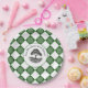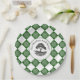 Ein stilvoller runder Party, der sich perfekt für einen Golfurlaub in einem Resort eignet. Der Hintergrund der Platte weist eine klassische, grün-weiße Raute auf, die einen hübschen, golfinspirierten Look hervorruft. In der Mitte des Tellers wird das Hotellogo hervorgehoben dargestellt, was dem Hotel ein berufliches und dennoch festliches Ambiente verleiht. Das Logo zeichnet sich durch seine glänzende, knusprige Linienführung aus, die die Raute zu einem Brennpunkt macht. Das Gesamtdesign des Tellers verbindet Eleganz mit einem spielerischen Thema und gibt den Ton für eine raffinierte und dennoch unterhaltsame Resort-Ansammlung.