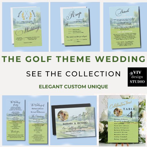 This watercolor Golf course wedding detail card is the perfect accompaniment to your invitation. It's a unique and special choice that will set the stage for your celebration. Much to personalize to make appropriate for your own event. If you want, you can easily delete the QR on the back. We have all the ingredients to make it a special event — starting with a save the date, wedding invitations; welcome poster; guest book; wine labels, guest favors for example -- just ask! Any design questions, just send a message or an email to charmdesignstudio@rcn.com and we’ll be delighted to assist. View the collection link on this page to see all.
