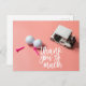 "Teilen Sie Ihre Dankbarkeit mit unserem Baby Girl Golf Ball Danke Postcard! Mit einem hübschen rosa Golfball-Design, das mit "Danke" in eleganter Schrift geschmückt ist, ist diese Postkarte der perfekte Weg, um nach der Feier der Ankunft unseres Kleinen seine Wertschätzung auszudrücken. Personalisieren Sie den Rücken mit Ihrer herzlichen Botschaft an Freunde und Familie, die unseren Tag besonders gemacht haben. Schicken Sie uns einen herzlichen Dank mit dieser bezaubernden Postkarte, die Liebe und Unterstützung feiert, während wir unser kleines Mädchen in der Welt willkommen heißen."