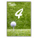 Dieser Tisch ist perfekt für Ihr Golf-Party! Es verfügt über einen Golfball auf einem Tee, umgeben von grünem Gras. Die Tischnummer ist mitten im Ball, sodass Sie leicht Ihren Platz finden können.