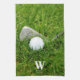 Handtuch mit individuellem Golf-Thema mit einem Golfclub und einem Ball auf grünem Gras. Verwenden Sie die Online-Vorlagenfelder, um mit einem Namen und Monogramm zu personalisieren.