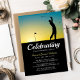 Beerdigungsdenkmal-Einladung mit einem Golfer mit einem Sonnenuntergang und einer Feier der Lebensvorlage, die leicht personalisiert werden kann. Eine große Hommage an alle, die gerne Golf spielen oder gucken.