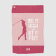 Niedliches golfer Zitat "T-Shirt It High & Lass it Fly!" Design bietet einen lustigen Schriftart Mitte des Jahrhunderts in Weiß auf einem Rechteck in hellen Korallen mit rosa Farbtönen, umgeben von zwei ergänzenden Single weißen Streifen auf einem soliden magentafarbenen Hintergrund. Der Text ist mit einer femininen Action golfer Silhouette in Bmagentafrot kombiniert. Anpassen mit mit Monogramm Initialen, Namen oder kurzem Text mit der einfach zu verwendenden Vorlage. Die Farbe des Zitats, Golfer und Handtuch ist anpassbar. Die Schriftart-Farbe oder der Stil der Initialen können ebenfalls angepasst werden. Typografie und Golfer sind vektorartige Grafik-Designs und können leicht auf andere Zazzle-Produkte, groß oder klein übertragen werden, und behalten Klarheit, ohne pixelig zu werden. Nachricht mit benutzerdefinierten Farbanforderungen von Fragen.