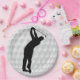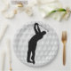 Paper party plate with image of a golf ball and a silhouette of a golfer in black and white.
