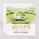 Ein charmantes und kreatives Hochzeitsdesign für Golfliebhaber. Diese Abbildung zeigt eine Golfbälle mit einem zarten Schleier und einen Bräutiggolfball mit einer Bugs-Krawatte, stehend nebeneinander auf einem schön getrimmten Putting Green. Umgeben von sanften Blumenakzenten und Golf-Themen, erweckt diese Einladung die Romantik und Persönlichkeit eines Paares, das das Spiel Liebe. Ideal für Hochzeiten im Freien, im Freien oder im Golf.