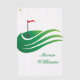 Dieses Golfhandtuch wird in weißer Farbe mit einem grünen Golfplatz-Grafik-Druck gezeigt.