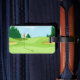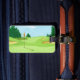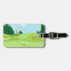 Flagge wirft Schatten über Übungsgrün, mit Sandfang, Fahrrinne und Bäumen im Hintergrund.