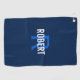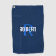 Modernes Golfhandtuch für ihn mit einem blauen Monogramm und einem weißen Namen auf dunkelblauem Hintergrund. Personalisieren Sie mit Name und Initial.