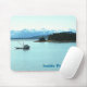 Ein Fischerboot führt durch das Wasser der Inside Passage, in der Ferne sind schneebedeckte Berge zu sehen. Die Inside Passage ist eine Küstenstraße für Ozeanschiffe entlang eines Netzes von Passagen, die sich durch die Inseln der Pazifikküste Nordamerikas weben. Die Route reicht von Südost-Alaska, in den Vereinigten Staaten, durch den Western British Columbia, in Kanada, bis zum nordwestlichen Washington Staat, in den Vereinigten Staaten. Schiffe, die die Route benutzen, können das Unwetter im offenen Meer vermeiden und einige der vielen abgeschiedenen Gemeinden entlang der Route besuchen. Die Inside Passage ist stark von Kreuzfahrtschiffen, Frachtern, Schleppnetzen mit Schleppnetzen, Fischereifahrzeugen und Schiffen der Alaska Marine Highway, BC Ferries und Washingtoner Staat Ferries Systeme befahren. Aus einem Foto des Künstlers.