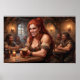 Inside a warmly lit medieval tavern, a red-haired woman with a cheerful expression holds a mug of ale, surrounded by jovial companions. The atmosphere is lively, with wooden beams and stone walls adding to the rustic charm.