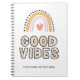 Glückliches und lustiges Design mit dem Text "Good Vibes" in schöner Boho-Schrift mit einem bunten Regenbogen.