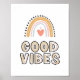 Glückliches und lustiges Design mit dem Text "Good Vibes" in schöner Boho-Schrift mit einem bunten Regenbogen.