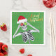 Diese Papierserviette hat ein goofy Skelett mit hellroten und grünen Ornamenten, die eine Weihnachtsmannmütze auf einem grünen Hintergrund mit goldenen Imitaten Glitzern tragen. Fröhlicher Weihnachtstext in leuchtendem Gold.