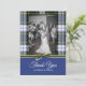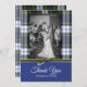 Custom Foto Hochzeit Dankeschön Karte in einem flachen Kartenstock mit Grafiken des klassischen schottischen Clan Gordon Dress Tartan Muster getan. Die Unterseite der Vorderseite der Karte ist in massivblauem Blau mit der Grafik eines grünen Farbbändes, oben. Personalisieren Sie mit Ihrem Hochzeitsbild und Text, um Ihre Bedürfnisse zu Anzug. Matching Gordon Dress Hochzeitsprodukte sind erhältlich.