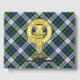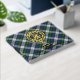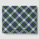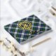 Clan Gordon Wappen Abzeichen umgeben von einem Gurt und Schnallen über das Kleid Tartan Hintergrund. Benutzerdefinierter Vorder-, Rücken- und Rückentext.