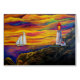 Ein Leuchtturm und vorbeifahrendes Segelboot bei Sonnenuntergang