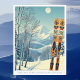 Hallo aus den schneebedeckten Bergen Gore Mountain, New York, Adirondack Berge! Wir hoffen, dass Sie einen wunderschönen Skiurlaub haben. Diese Postkarte zeigt eine wunderschöne, blau-graue Berglandschaft mit Retro-Skischulen in orangefarbenem Stammesmuster. Alle Textsätze können an Ihren Anzug angepasst werden!