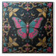 Eine Vintage Keramik mit rosa und zyanischem Schmetterling und goldenen Ziergegenständen auf schwarzem Hintergrund