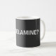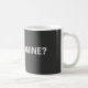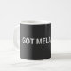 Klassische Tasse des weißen Kaffees fragt "got Melamin?" Mutige weiße Beschriftung auf einem ausdehnenden schwarzen Hintergrund umgeben durch eine rote Grenze.