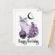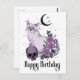 Gothic glücklicher Geburtstag wünscht Gruß Postkarte. Gothkatze mit Halbmond, Schädel und Rose in einem schwarzen und lila Farbschema, das Ihr Gothmädchen Liebe. Passen Sie das Eingabefeld für eine wirklich magische Geburtstagskarte an.