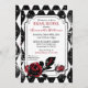 Alice im Wunderland inspirierte Brautdusche Einladungskarte. Grunge-Look Diamantprint mit rote Rosen Königin der Herzen Thema.