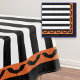 Zu Halloween ist ein schwarz-weiß gestreiftes Tischtuch mit orangefarbenem Rahmen, dessen Fledermäuse über einer schwarzen Grenze liegen. Perfektes Tischtuch für Ihre Halloween-Partys und Veranstaltungen, vielleicht auch eine Halloween-Babydusche oder Geburtstagsfeier!