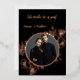 This elegant wedding invitation features a photo and rose gold foil flowers on a black background. Bride and groom names in an elegant handwritten script. "Till death do us part" headline