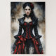 Eine atemberaubende junge Gothierin mit fesselnden Features wie schwarze Haarkaskaden. Sie trägt schwarz und rot Kleid Gothic Punk Rave Long Coats Frauen Steampunk Viktorianisch Retro Kleid Brocade Jacket.