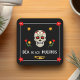 Untersetzer zeigt einen Schädel mit Herz in den Augen, Blume und ein Kreuz auf der Stirn. Dia de los Muertos Text liegt unterhalb des Zuckerschädels. Es gibt Blume, Herz, Trompete und Shakers. Hintergrund ist schwarz. Schönes, gediegenes hispanisches Urlaubsdesign. Feiern Sie den Tag der Toten im Oktober / November rund um Halloween. Schützen Sie Ihre Tische und Möbel mit diesen Untersetzer. Ein Produkt in einer Party-Suite.