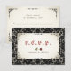Diese 5" x 3,5" Hochzeitskarten haben einen gotischen Stil mit schwarz-beinen Imitaten auf verwittertem Papier mit Mocha und blutrot. Die Rückseite hat das gleiche verwitterte Papier und den Rand wie die Vorderseite mit Platzhaltern mit Zeilen für den Gast, um ihren Namen zu füllen und ihre Wahl für die Teilnahme zu wählen.