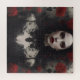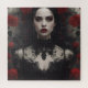 Eine gotische Braut in ihrem schwarzen Hochzeitskleid, umgeben von rote Rosen, ist für ihre Halloween-Hochzeit bereit. Kunst der AI
