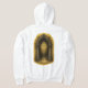 This unique zip-up hoodie features a striking, high-contrast design. The back showcases a dramatic **Gothic Archway** opening to a luminous **Cross** (The Path to Salvation), rendered in rich gold and brown tones. This powerful art print is perfectly contrasted by a **Minimalist Cross** design on the front chest.