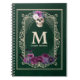 Gothic floral Skull Custom Monogram & Name Green Notebook. Individuelle Name- und Monogramm-Gothic-Skizzenbuch mit Schädel mit Blume Kronen umgeben von Vintagen barocken Wirbel Rand, Blume Spinnennetz und Fledermäuse über bedrücktem schwarzen Hintergrund.