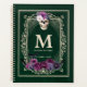 Gothic floral Skull Custom Monogram & Name Green Planner. Individuelle Name- und Monogramm-Gothic-Planer mit Schädel in Blume Kronen umgeben von Vintag barocken Wirbel Rand, Blume Spinnennetz und Fledermäuse über bedrücktem schwarzen Hintergrund.