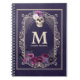 Gothic Floral Skull Custom Monogram & Name Navy Notebook. Individuelle Name- und Monogramm-Gothic-Skizzenbuch mit Schädel mit Blume Kronen umgeben von Vintagen barocken Wirbel Rand, Blume Spinnennetz und Fledermäuse über bedrücktem schwarzen Hintergrund.