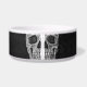 Cooles gotisches makabre Schwarz-Weiß-Design. Grunge Textur Druck halb Schädel Kopf Hund Wasser Schalen. Spooky, gruselig, böse, finster. Benutzerdefinierter Text zum Anzug Ihrer Bedürfnisse. Trendy, einzigartig, modern, beängstigende Halloween inspiriert Haustierzubehör. Bildrecht Marg Seregelyi Fotografie.