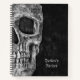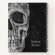 Gotische makabre schwarz-weiße Grunge Textur Druck halb Schädel Spirale Rezeptur Kochbuch Notebook. Spooky, gruselig, böse, finsteres Design. Individuelle Typografie. Cool, trendig, einzigartig, modern, beängstigender Halloween-Stil. Bildrecht Marg Seregelyi Fotografie.