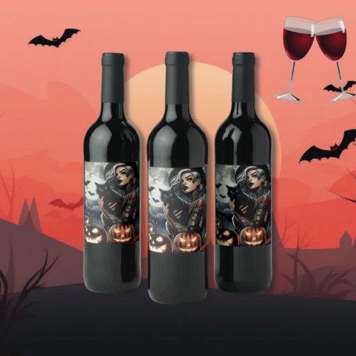 Hexe Halloween-Karte. Eine göttliche gotische Tätowierung mit einer schwarzen Katze, Fledermäuse und Vollmond-Grafik.