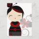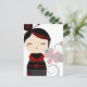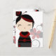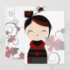 Diese Kokeshi trägt einen Kohlekimono mit Blume. Ihr Kimono hat Blume und Wirbel mit roten Stichen.
