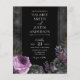 Gotische Lila und schwarze Blütenhochzeit Einladungen. Imitate golden florale Blätter. Skript-Schriftart-Highlights mit leicht lesbaren Serifennamen Schriftart. Leicht an Ihre Hochzeitsbedürfnisse anzupassen. Alles in einer Einladung