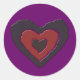 Dieses runde Aufkleber-Blatt zeichnet sich durch ein schönes digitales Bild eines gotischen Schwarz-Rot-Herzens mit geröteten Kanten aus, die mit einem ätherischen Licht glänzen und schmelzen. Der Hintergrund ist lila.