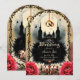 This gothic wedding design captures the dark beauty of everlasting love — a black cathedral bathed in moonlight, golden wedding rings suspended like celestial promises, and roses blooming in crimson passion.Perfect for those who believe that love doesn’t have to be light to shine forever.